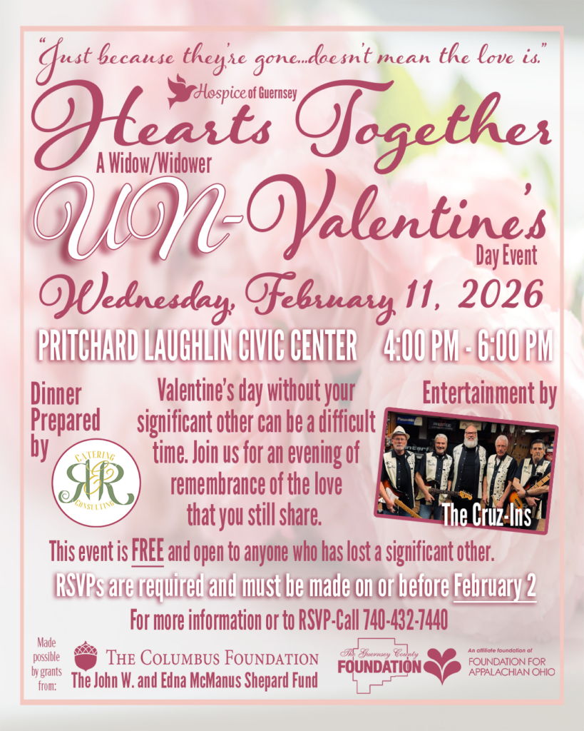 September 24– Coffee with Chris Dyer (former Hospice chaplain): Men’s coffee/support group at Wendy’s on East Wheeling Ave., Cambridge at 9:00 AM. Call for information.